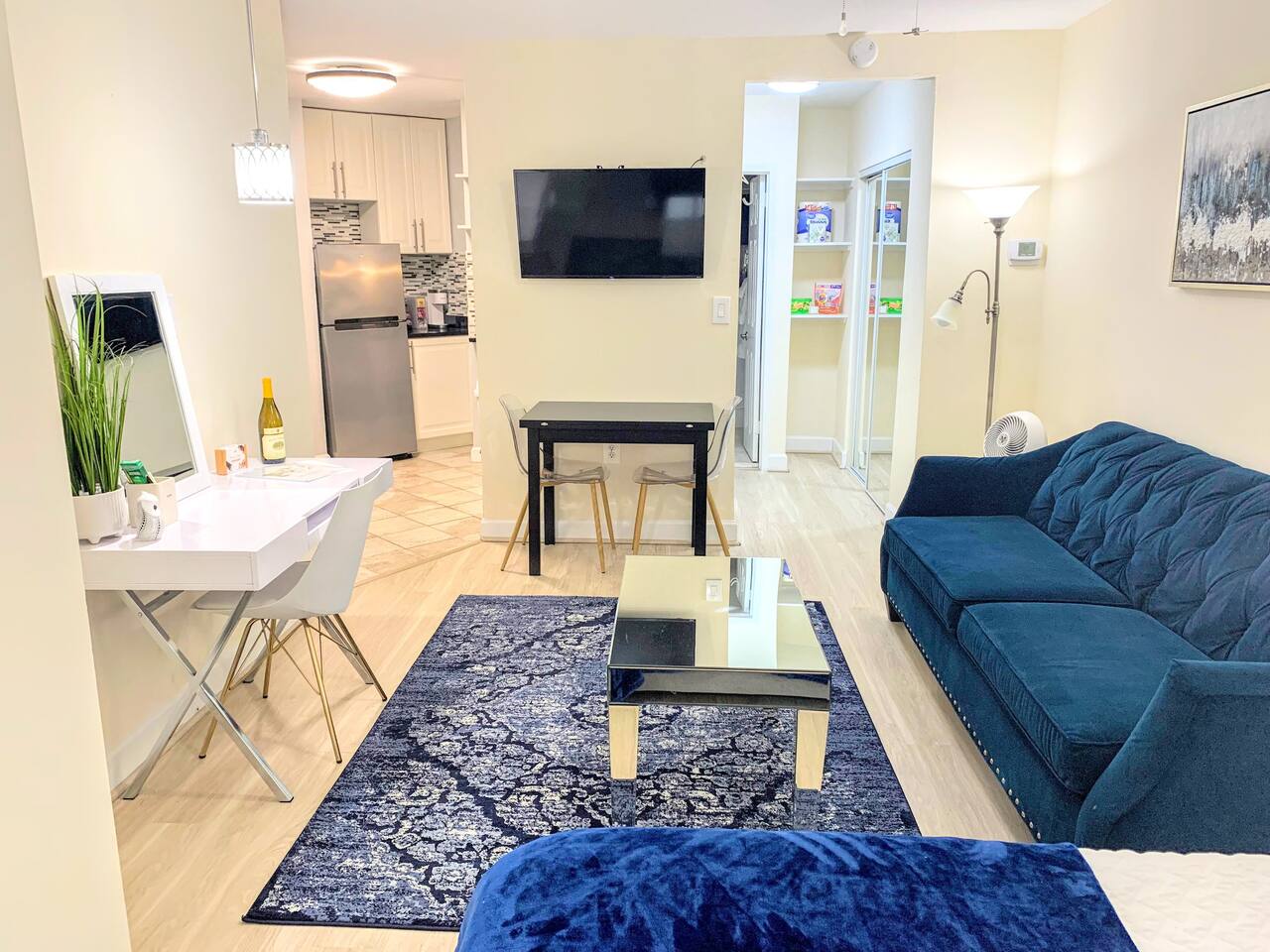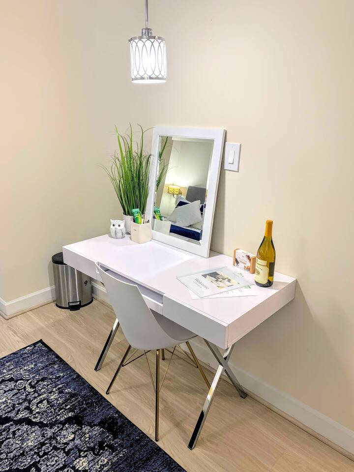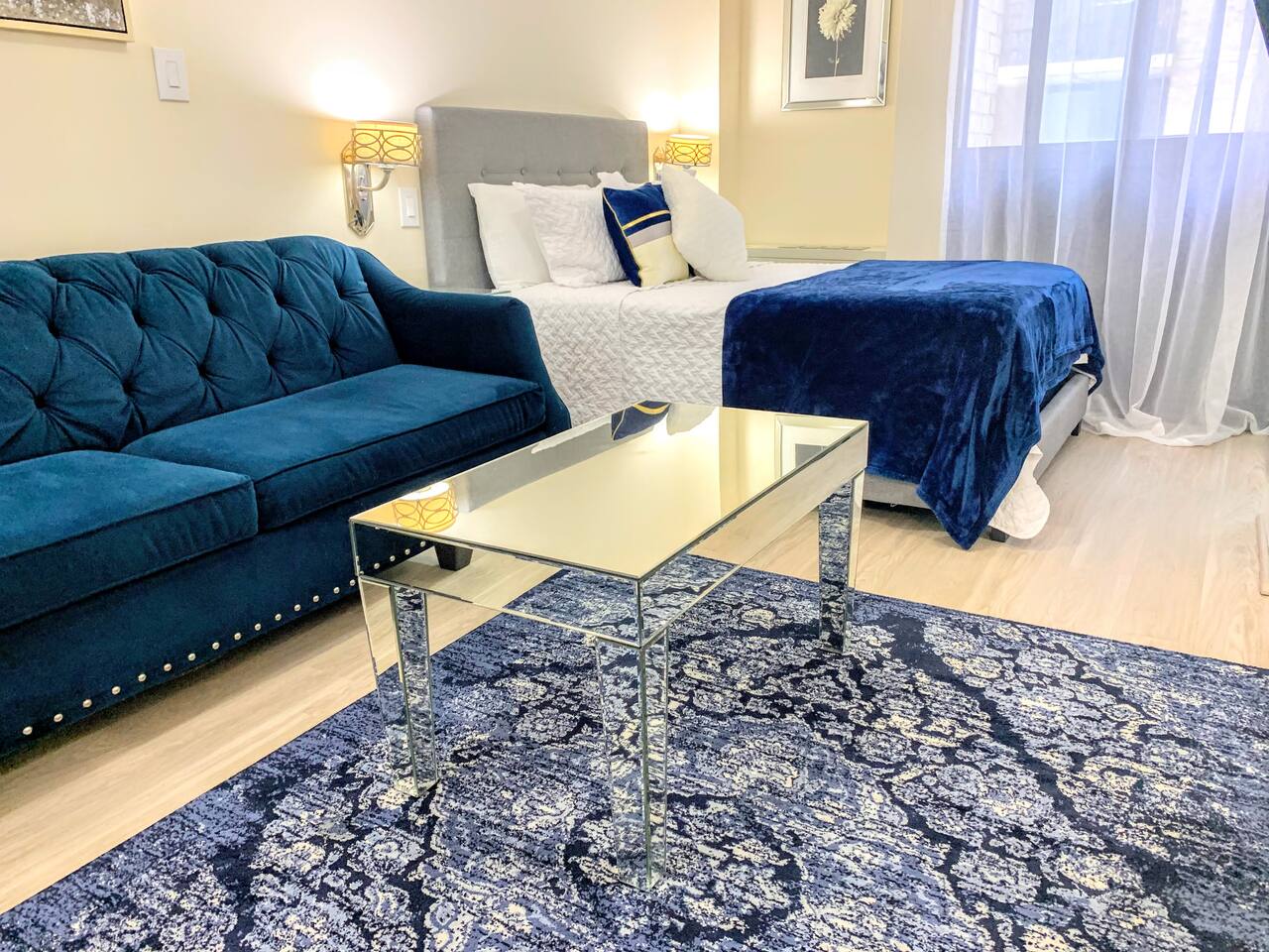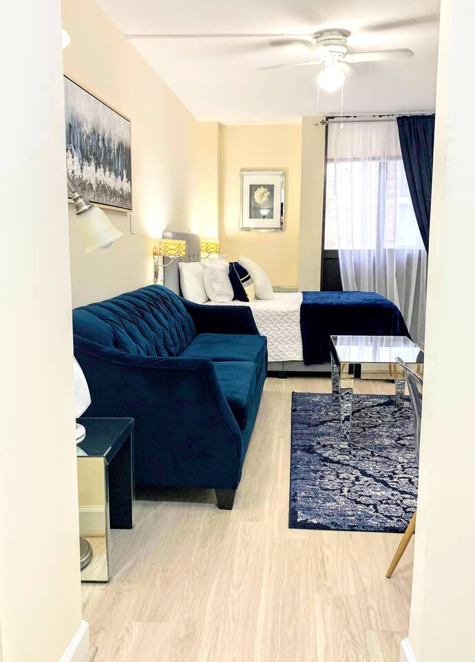 Relax and make yourself at home in this beautiful, spacious studio! Soothing blue tones, hardwood floors, a renovated kitchen, and modern decor have been carefully curated add a modern touch to your stay. If you're working or studying remotely, this is the perfect space for you! The apartment is furnished with a modern desk, high-speed internet, and everything you need to focus and be productive. When you're ready to relax, kick back on a plush, comfortable sofa and turn on your favorite show on the Smart TV. Finally, finish out your week with shopping trip in Downtown Bethesda, a meal or a drink at one of the many local restaurants and bars, or a Metro ride into the heart of DC for sightseeing and entertainment!