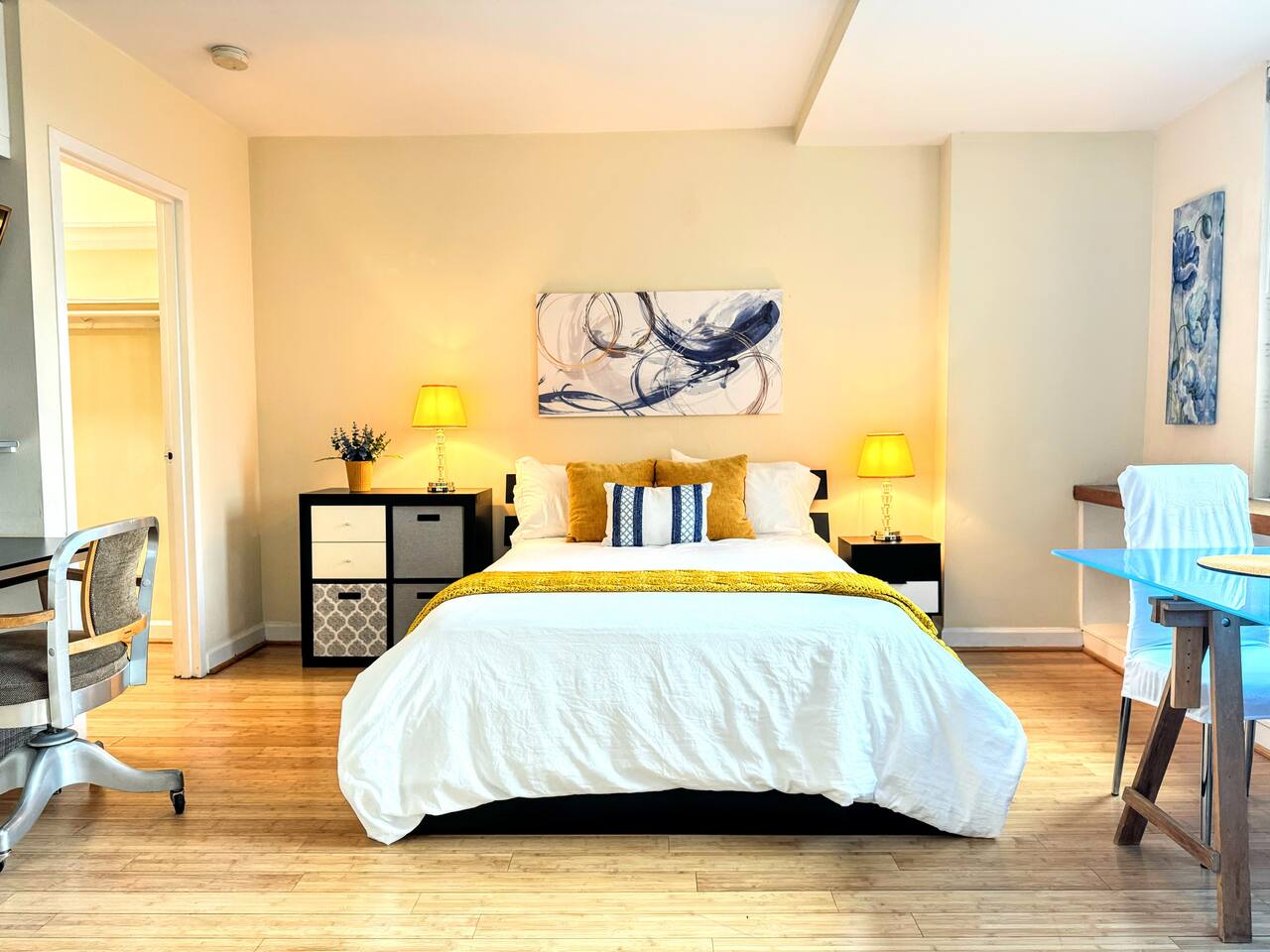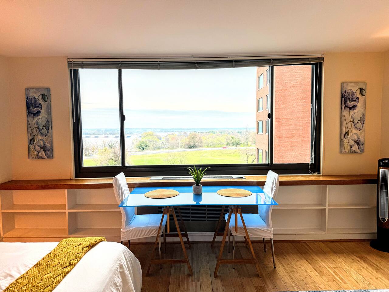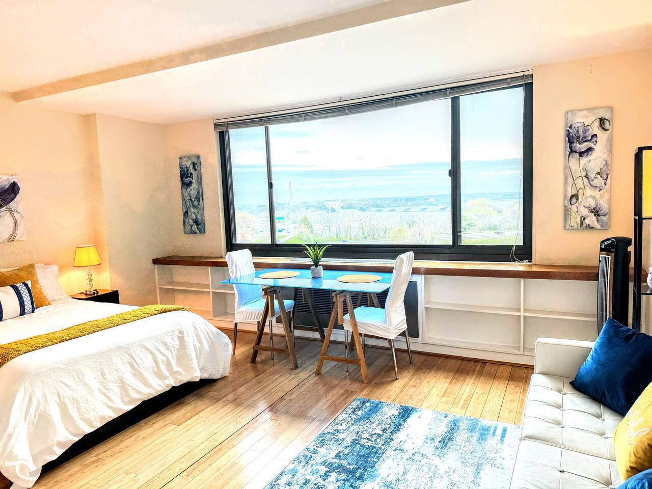 Keep it simple at this peaceful and centrally-located space. Newly renovated, stylish studio with granite counters, gas stove, walk-in closet, full-size bed, standing desk, city view, and fast Wi-Fi. Shuttle or stroll to DC's trendy Georgetown; Rosslyn metro station, 1 stop to Foggy Bottom. Gated, campus-like grounds, concierge service, resort-style pool, on-campus gym w/free fitness classes, sauna, steam room; on-site market, hair salon, picnic tables, and food trucks.